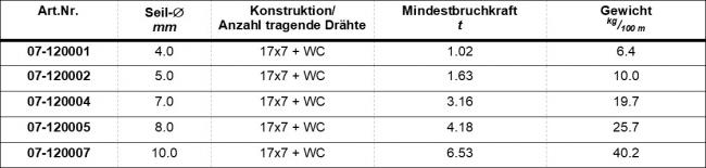 Hubseil Rotex Drahtseile in drehungsarmer Konstruktion (Klasse B), aus verzinktem Stahldraht, als Hubseil für Turmdrehkrane, Kleinkrane und für Elektrozüge. Drahtnennfestigkeit 1'960 N/mm2