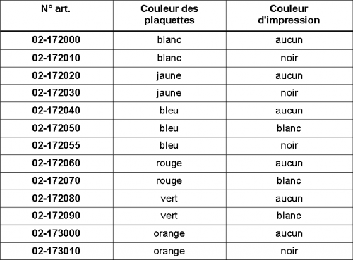 Plaquettes en plastique, dimensions 27 x 43 mm, ancrage ondulé, avec numérotation croissante jusqu'à 99'999, texte jusqu'à 6 lettres.